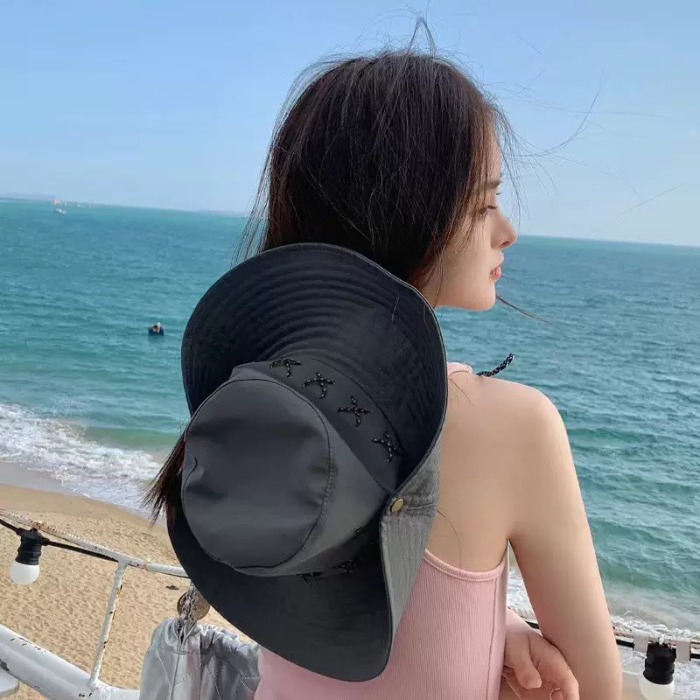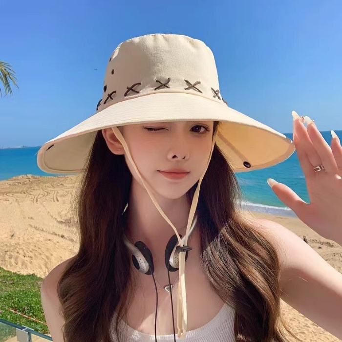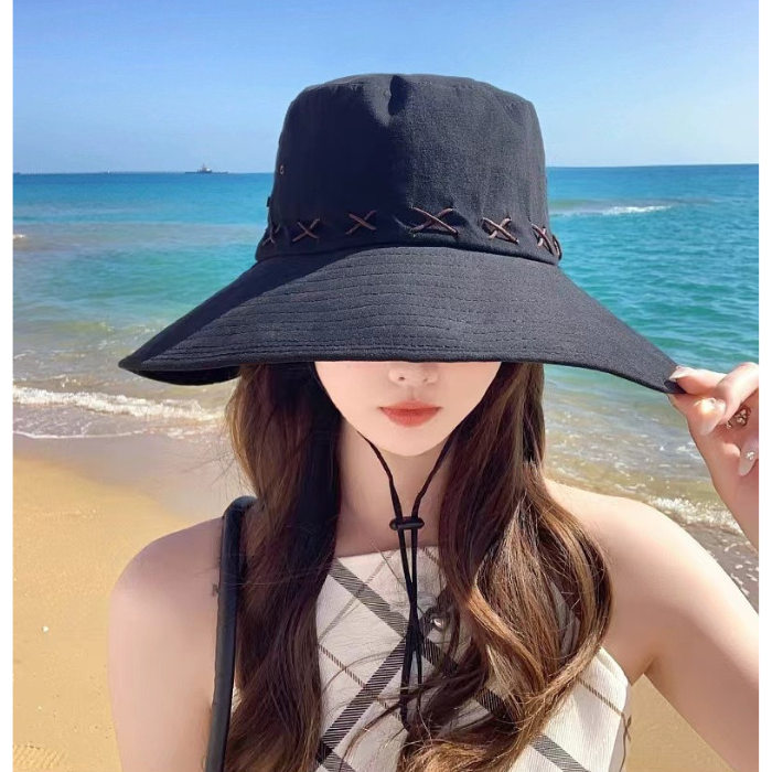 つばが広く日差しをしっかり遮るため、夏の日焼け対策に最適な紐付きデザイン。