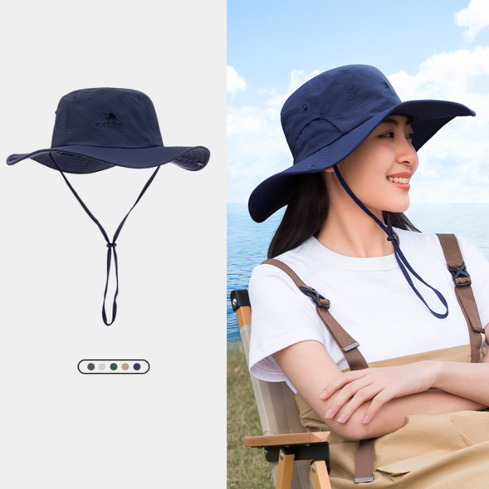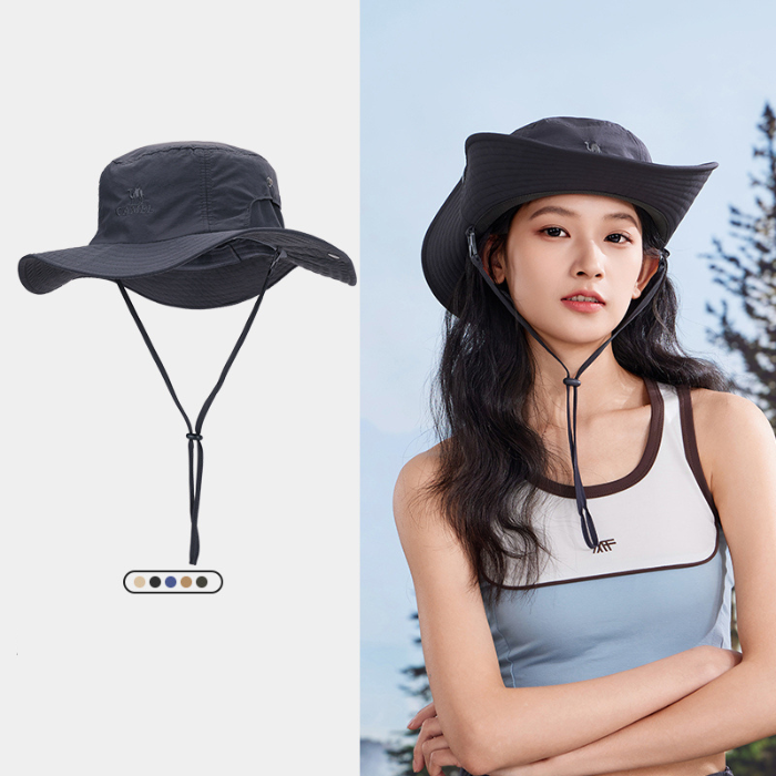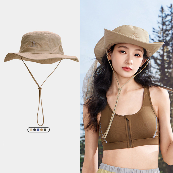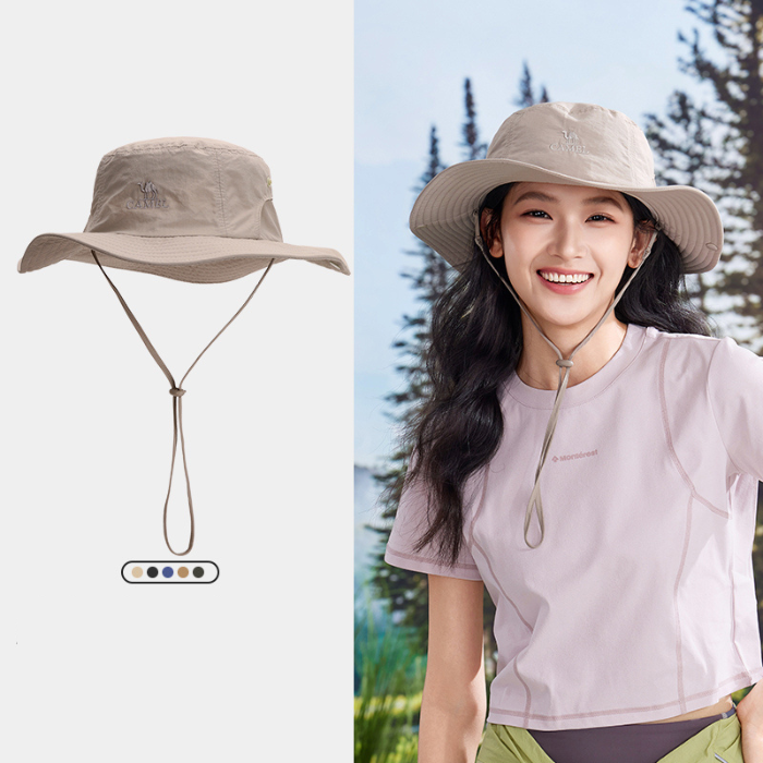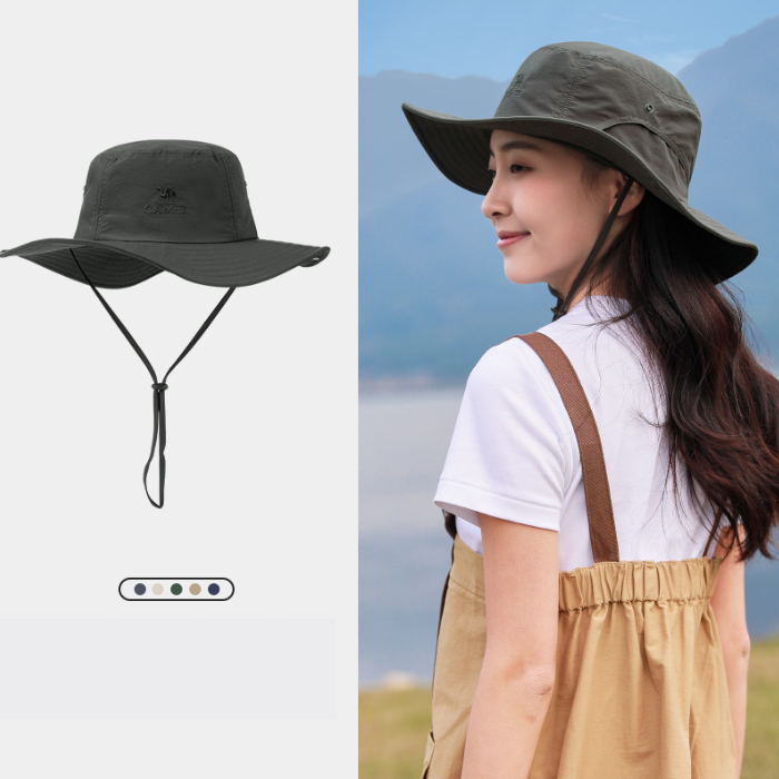 アウトドアシーンを彩る紐付きバケットハット。広めのつばで日差しをしっかり遮り、頭部には山の刺繍が施された洗練されたデザイン。