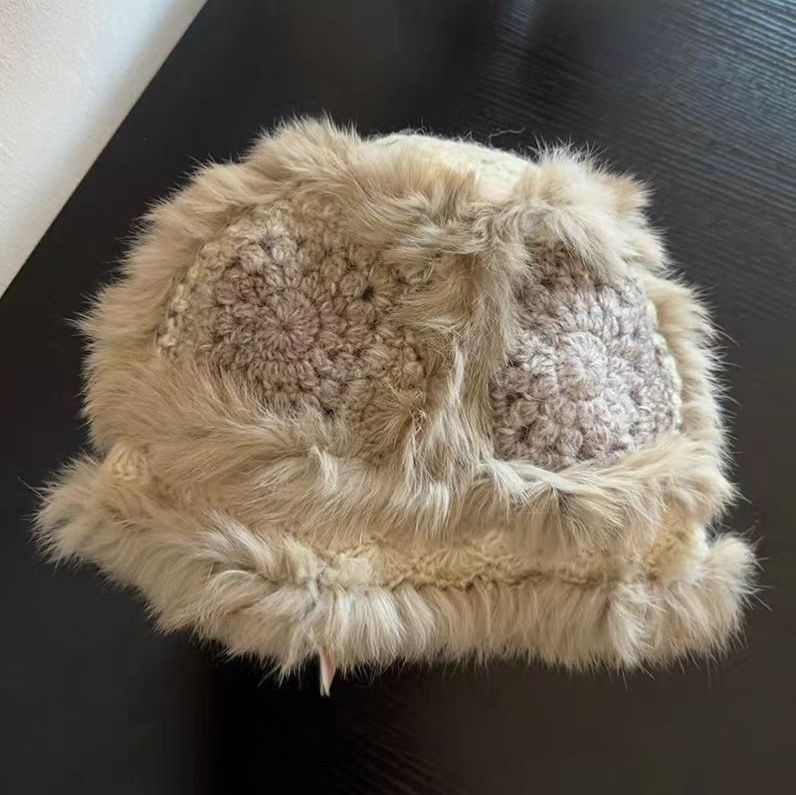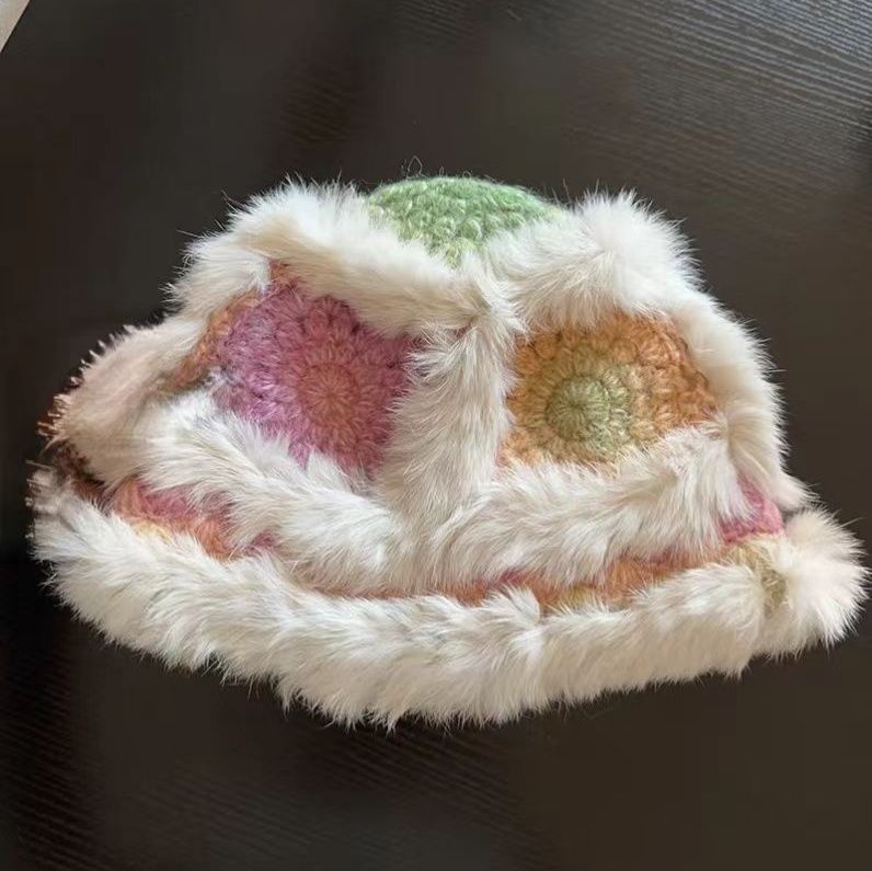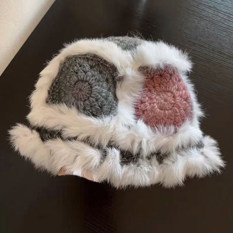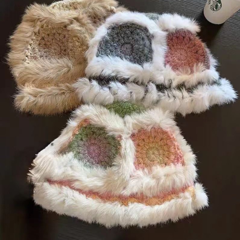 ふわふわとしたファー素材と編み物を組み合わせた個性的なバケットハットです。