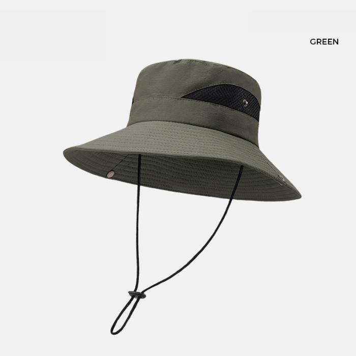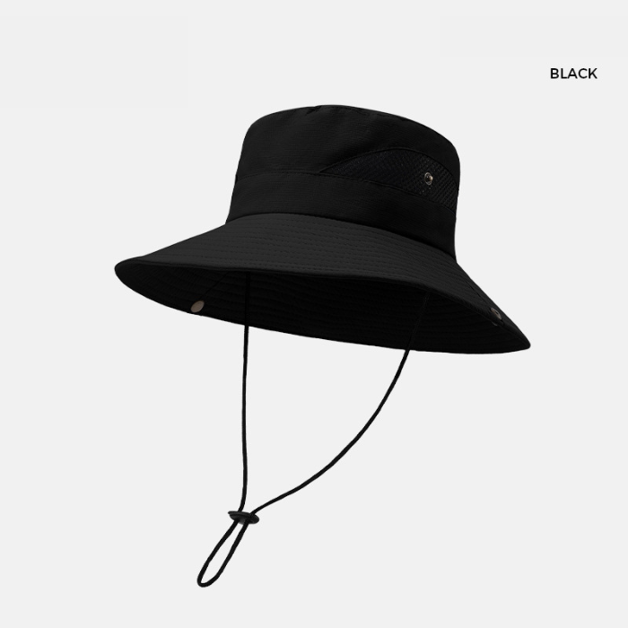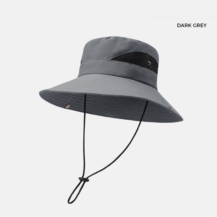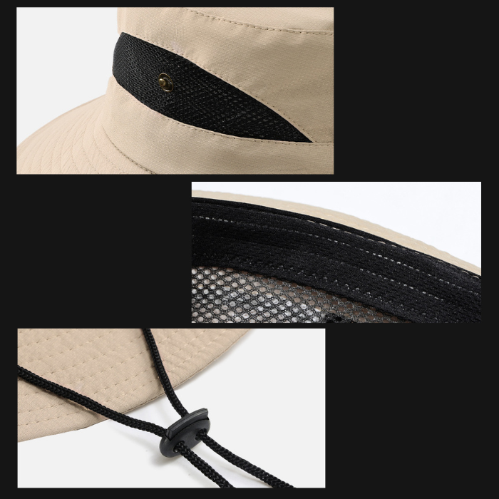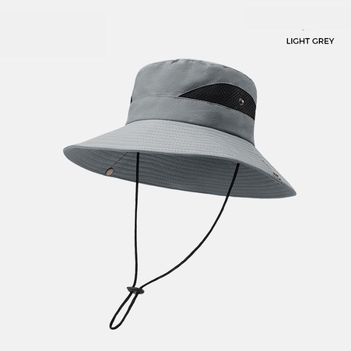 アウトドアやレジャーに最適な紐付きバケットハットです。