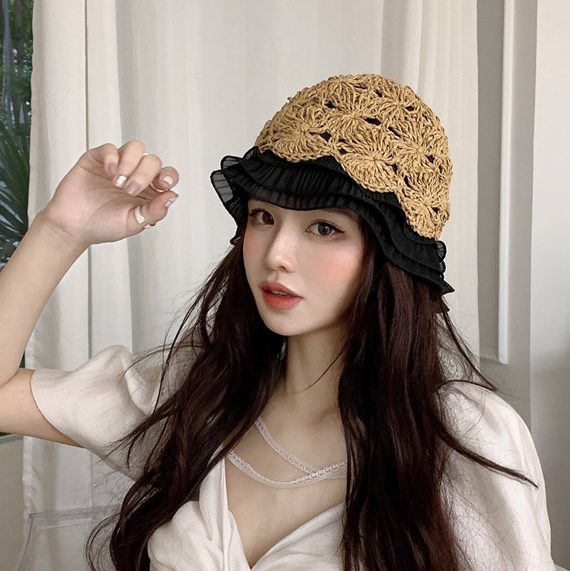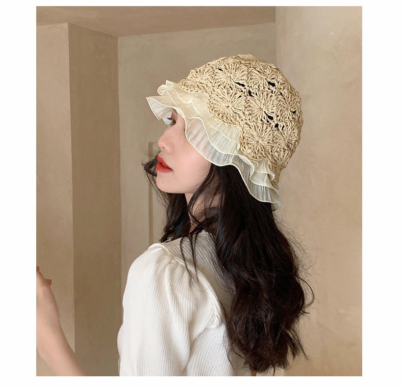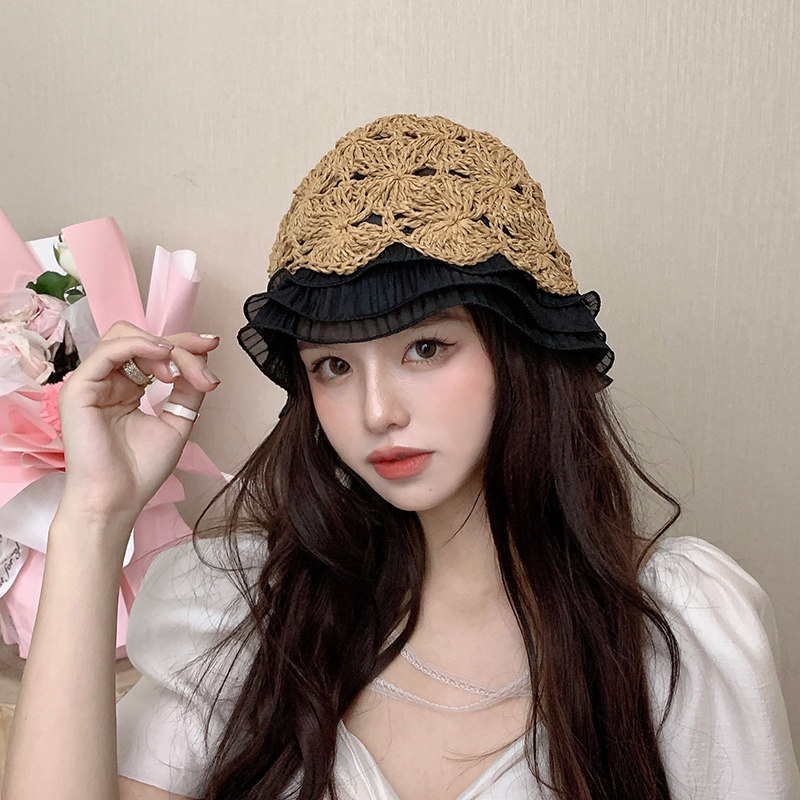 編み物ならではの立体的な模様が上品な印象を与え、つば部分にあしらった波打つフリルが女性らしさを演出します。